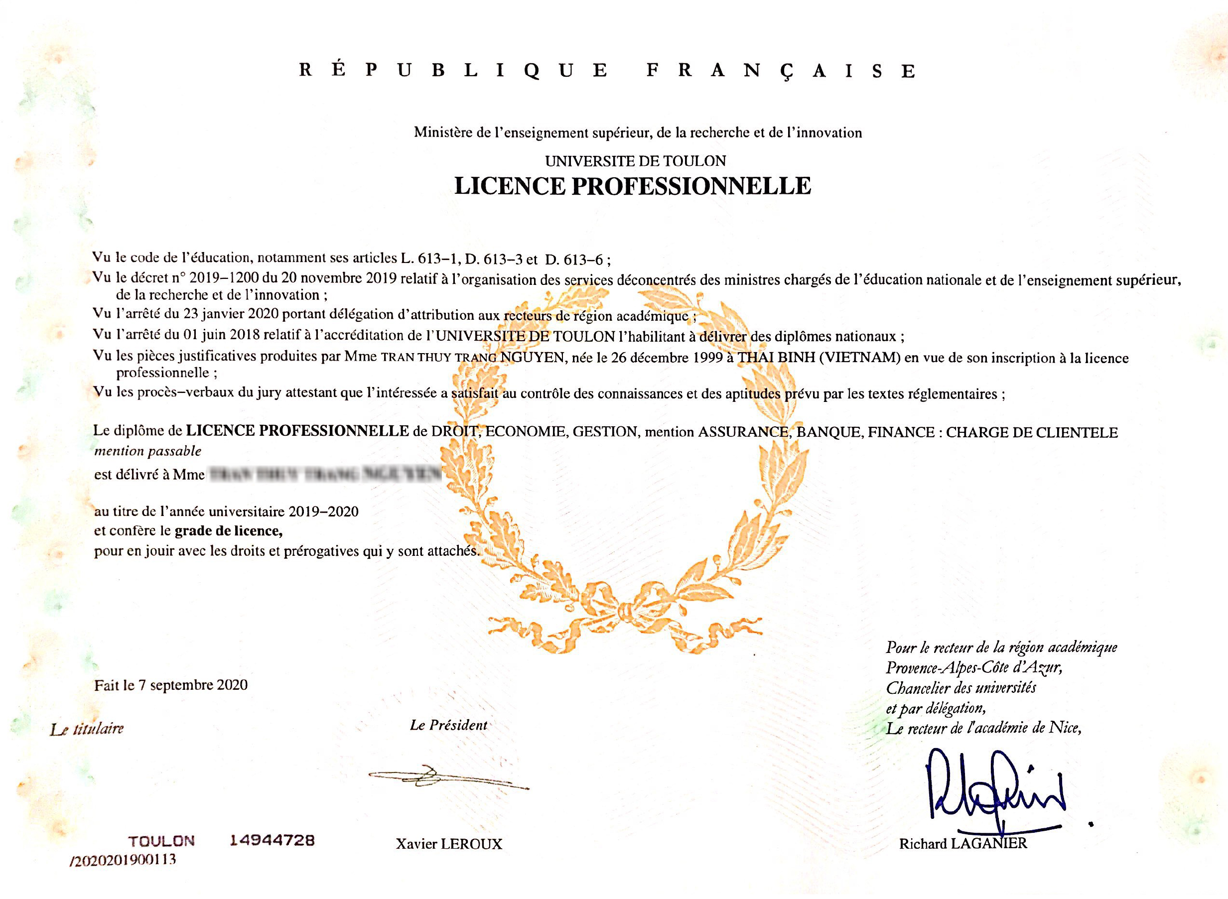 Sinh viên tốt nghiệp sẽ được cấp bằng Cử nhân Bảo hiểm–Tài chính–Ngân hàng do Đại học Toulon, Pháp cấp. Văn bằng có giá trị quốc tế và được Bộ GD&ĐT Việt Nam công nhận.