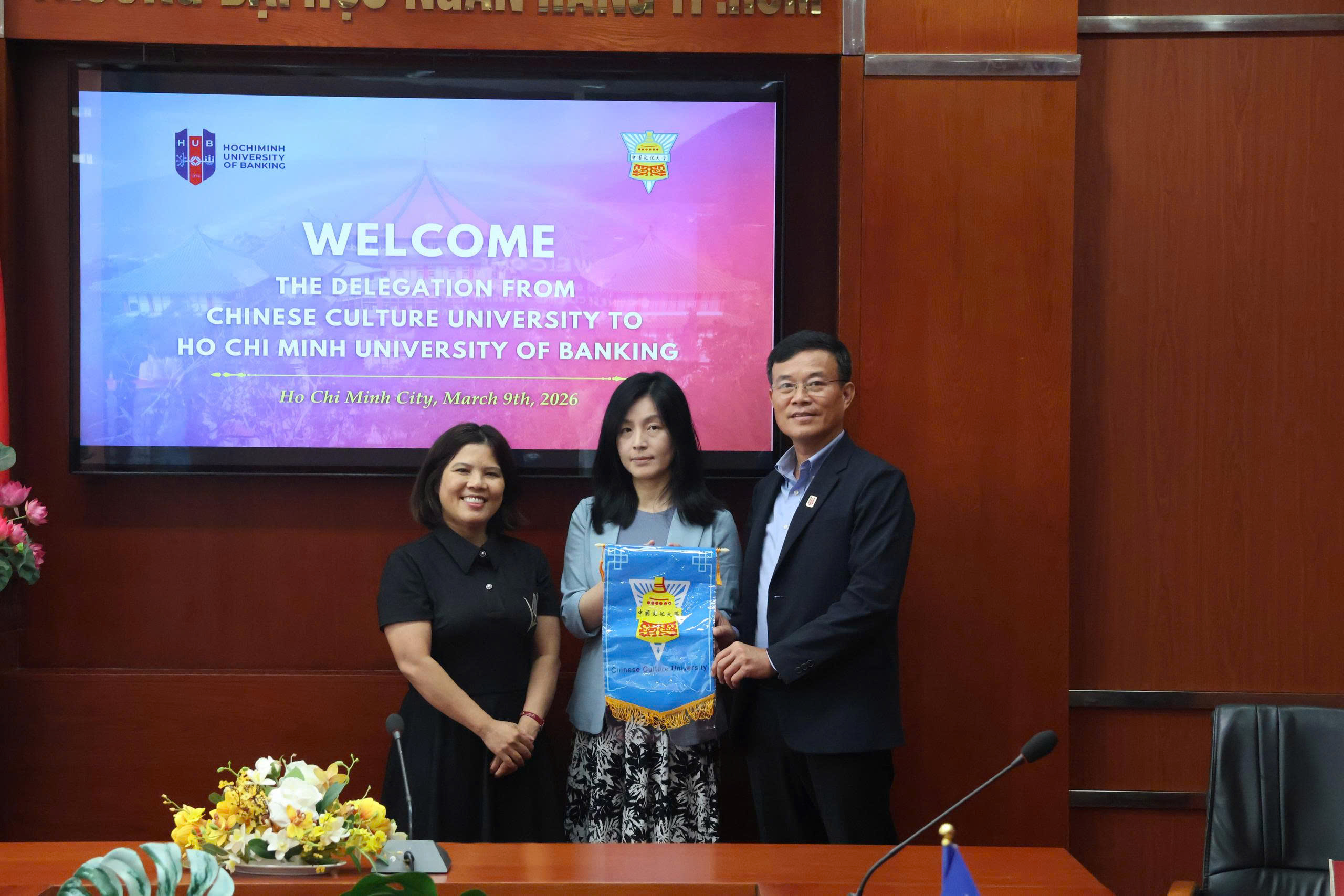 Sáng ngày 9/3/2026, tại cơ sở Tôn Thất Đạm, Trường Đại học Ngân hàng Thành phố Hồ Chí Minh (HUB) đã có buổi làm việc với đoàn đại diện Đại học Văn hóa Trung Quốc (CCU) nhằm trao đổi và tìm hiểu các định hướng hợp tác trong đào tạo ngành ngôn ngữ, trong bối cảnh HUB đang tích cực hoàn thiện và triển khai chương trình đào tạo ngành Ngôn ngữ Trung Quốc dự kiến từ năm 2026.