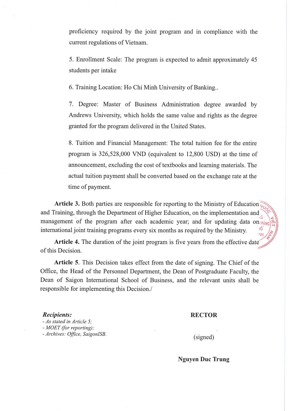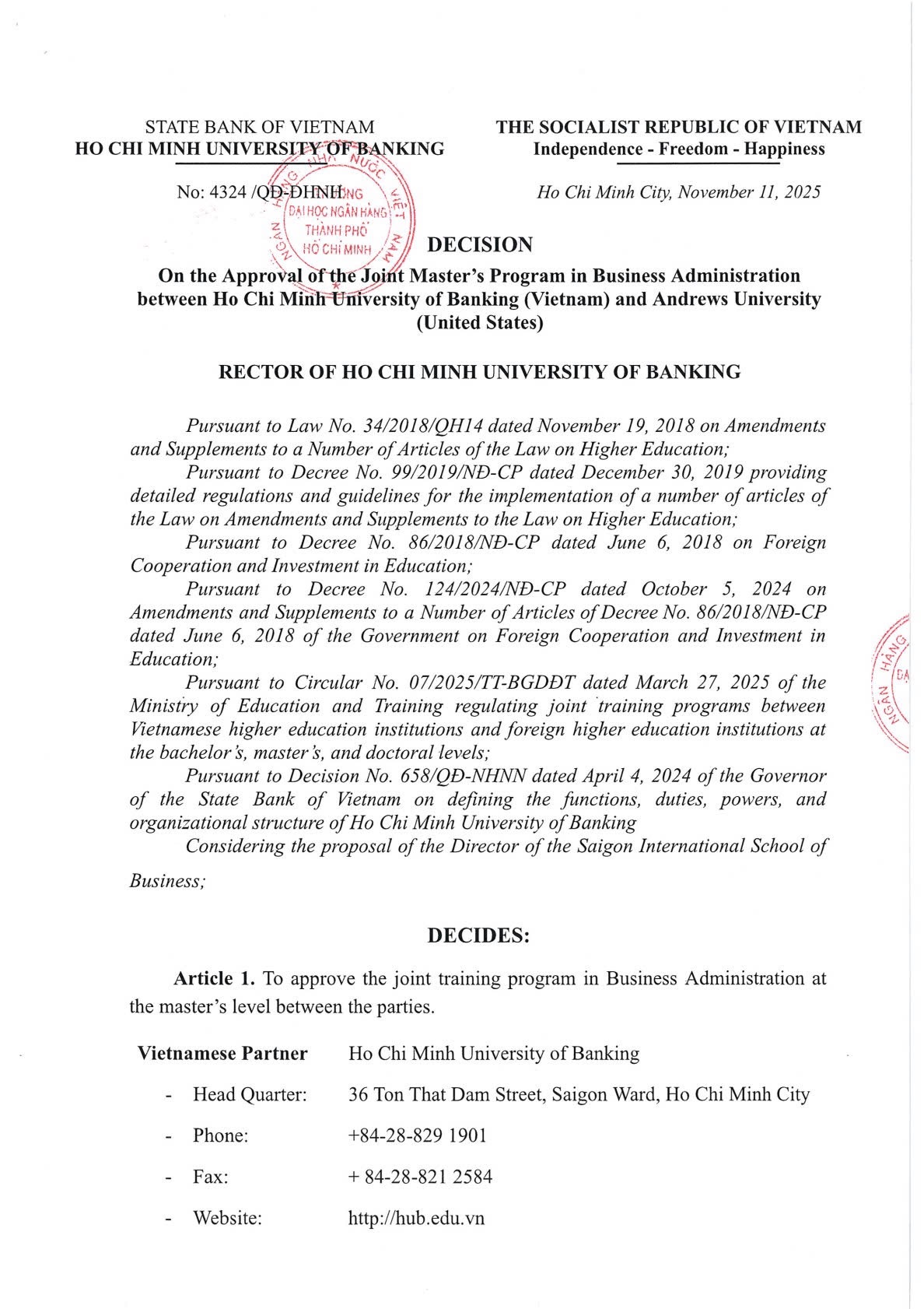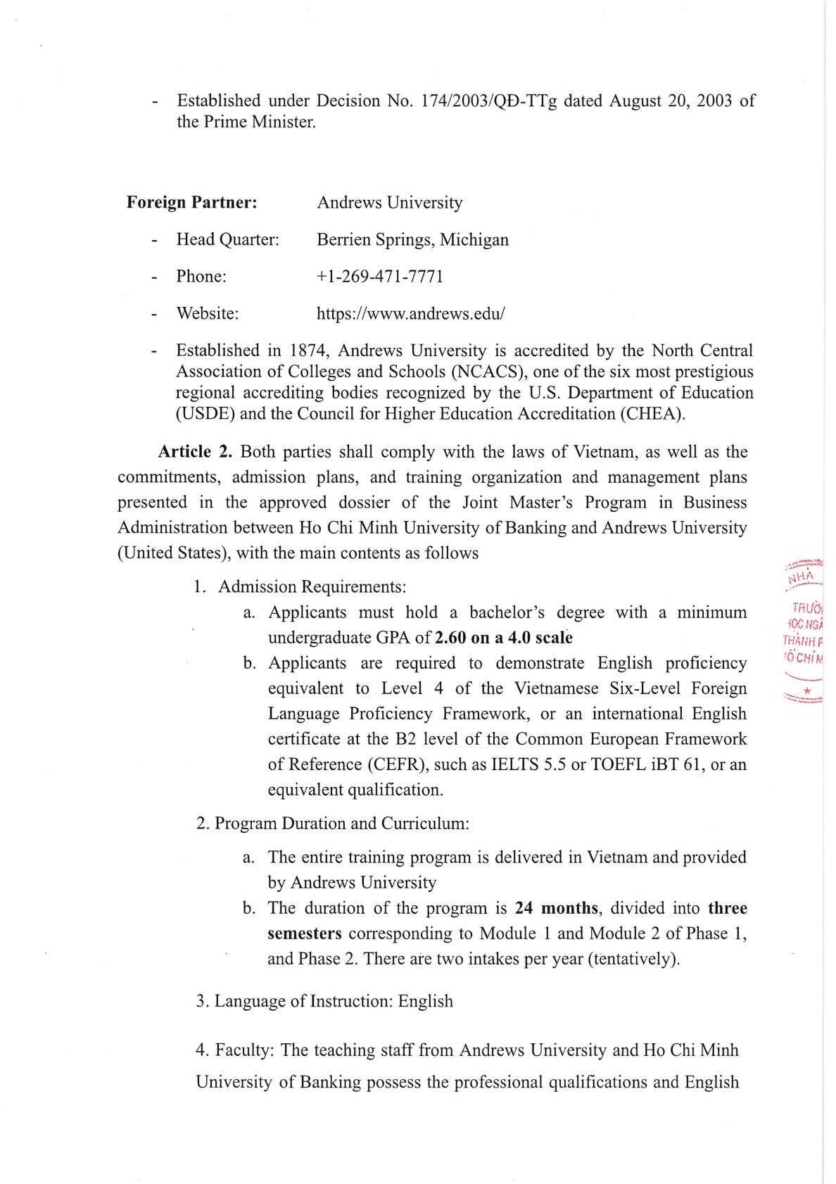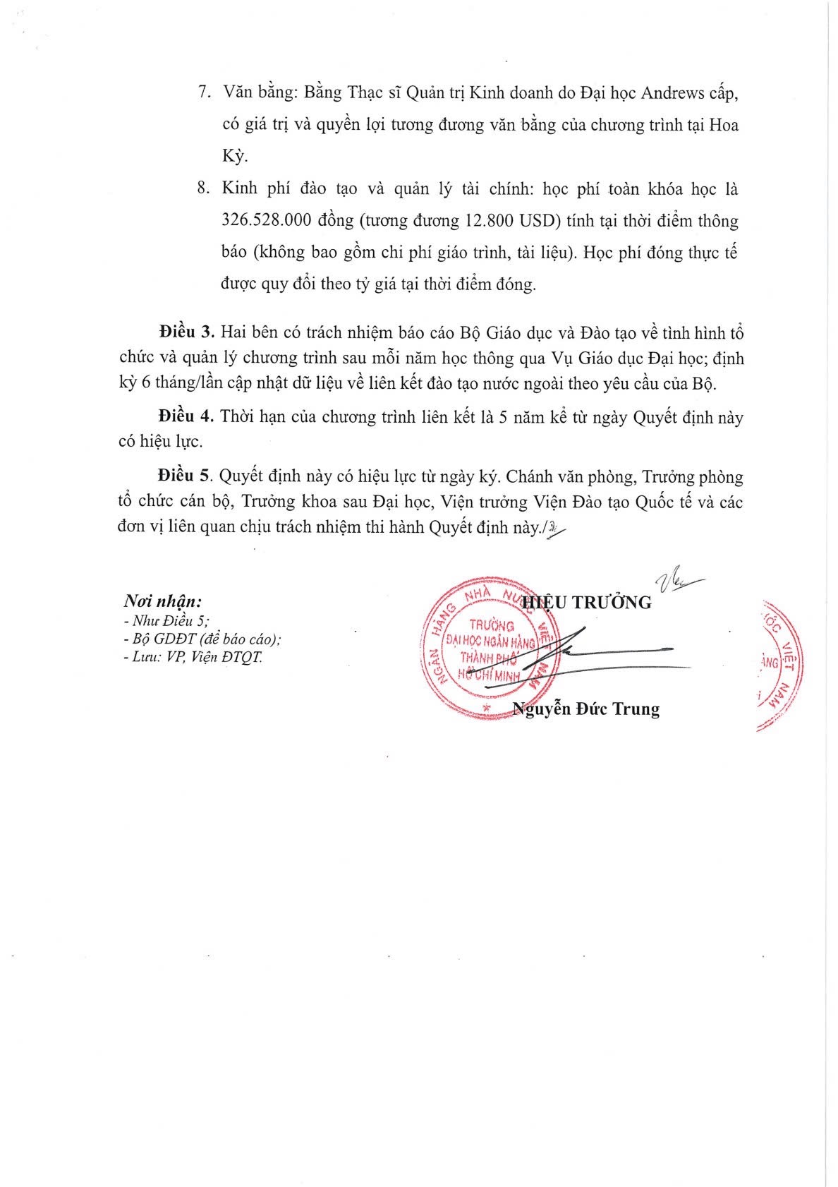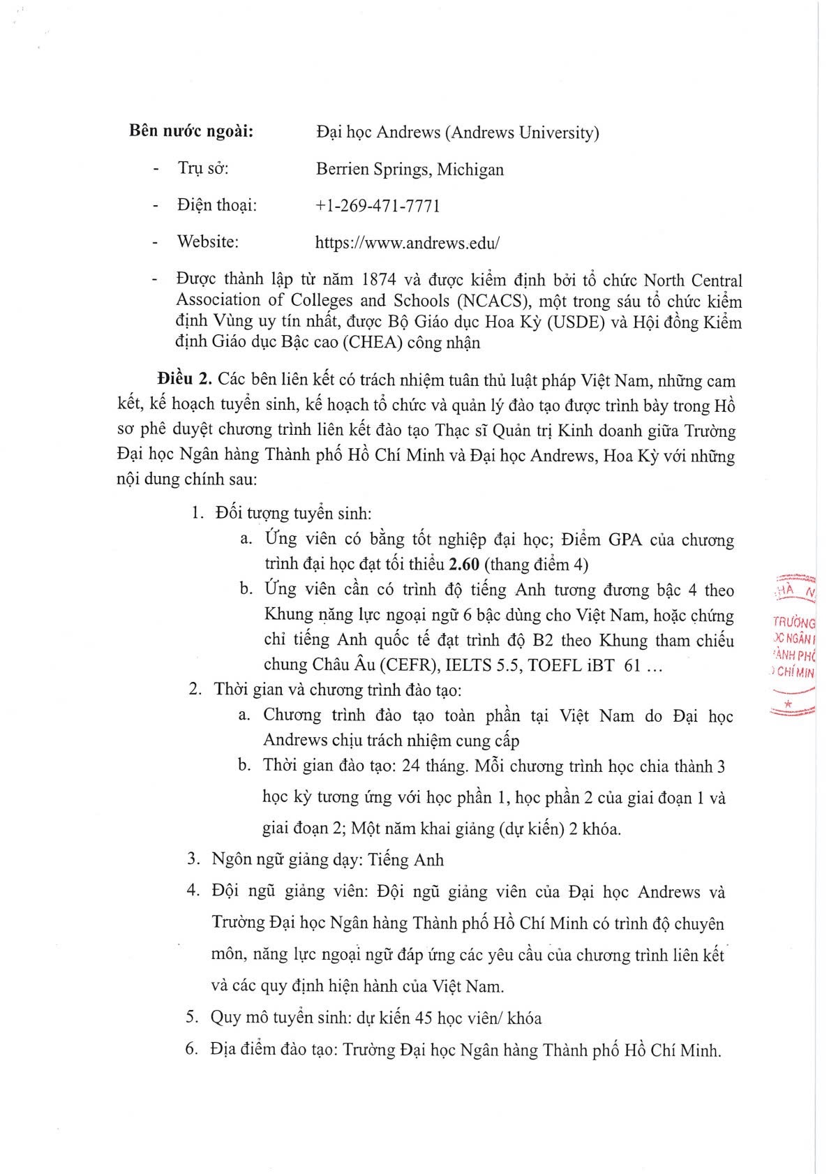 Quyết định phê duyệt chương trình liên kết đào tạo Thạc sĩ Quản trị Kinh doanh giữa Trường Đại học Ngân hàng Thành phố Hồ Chí Minh (Việt Nam) và Đại học Andrews (Hoa Kỳ)