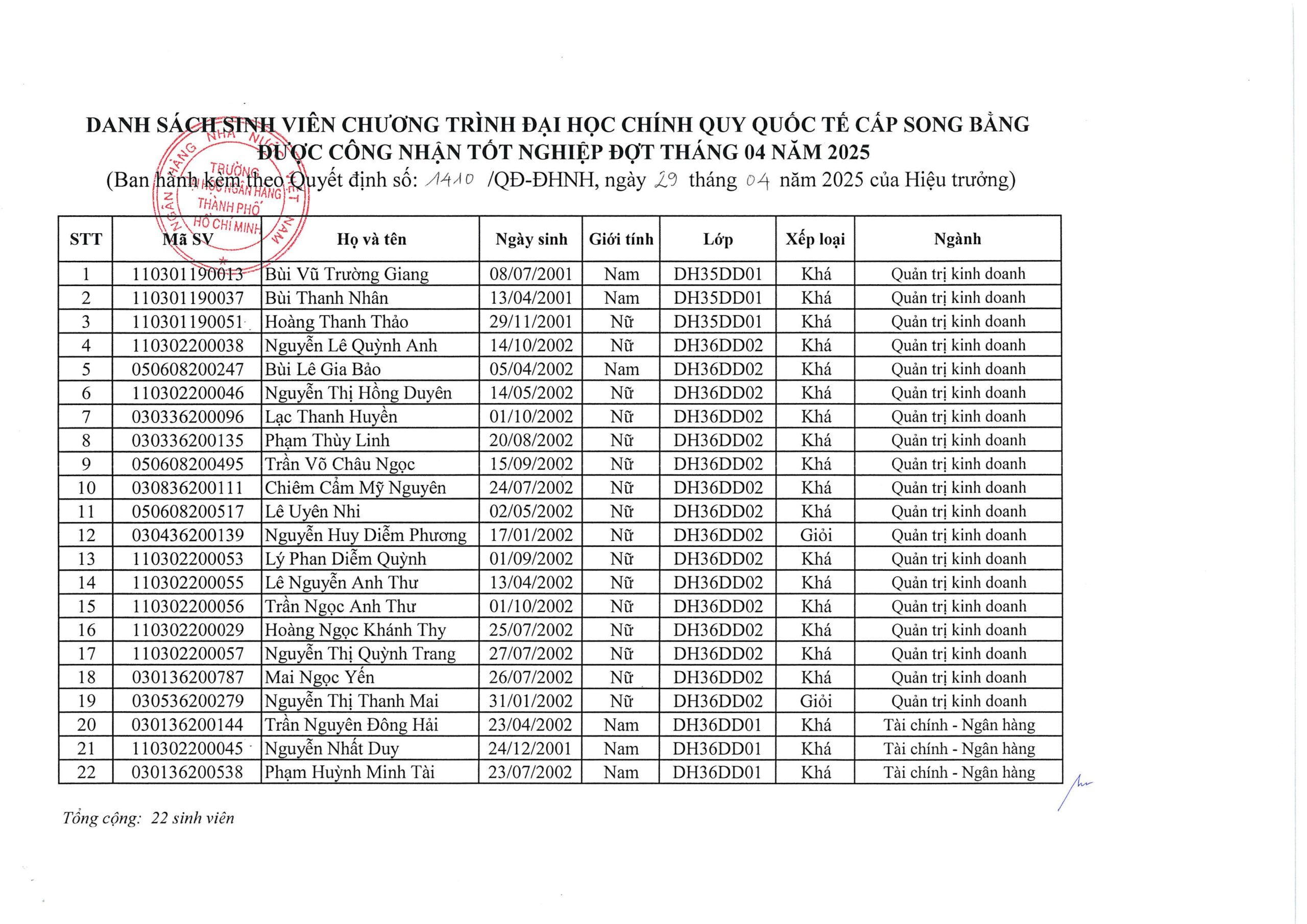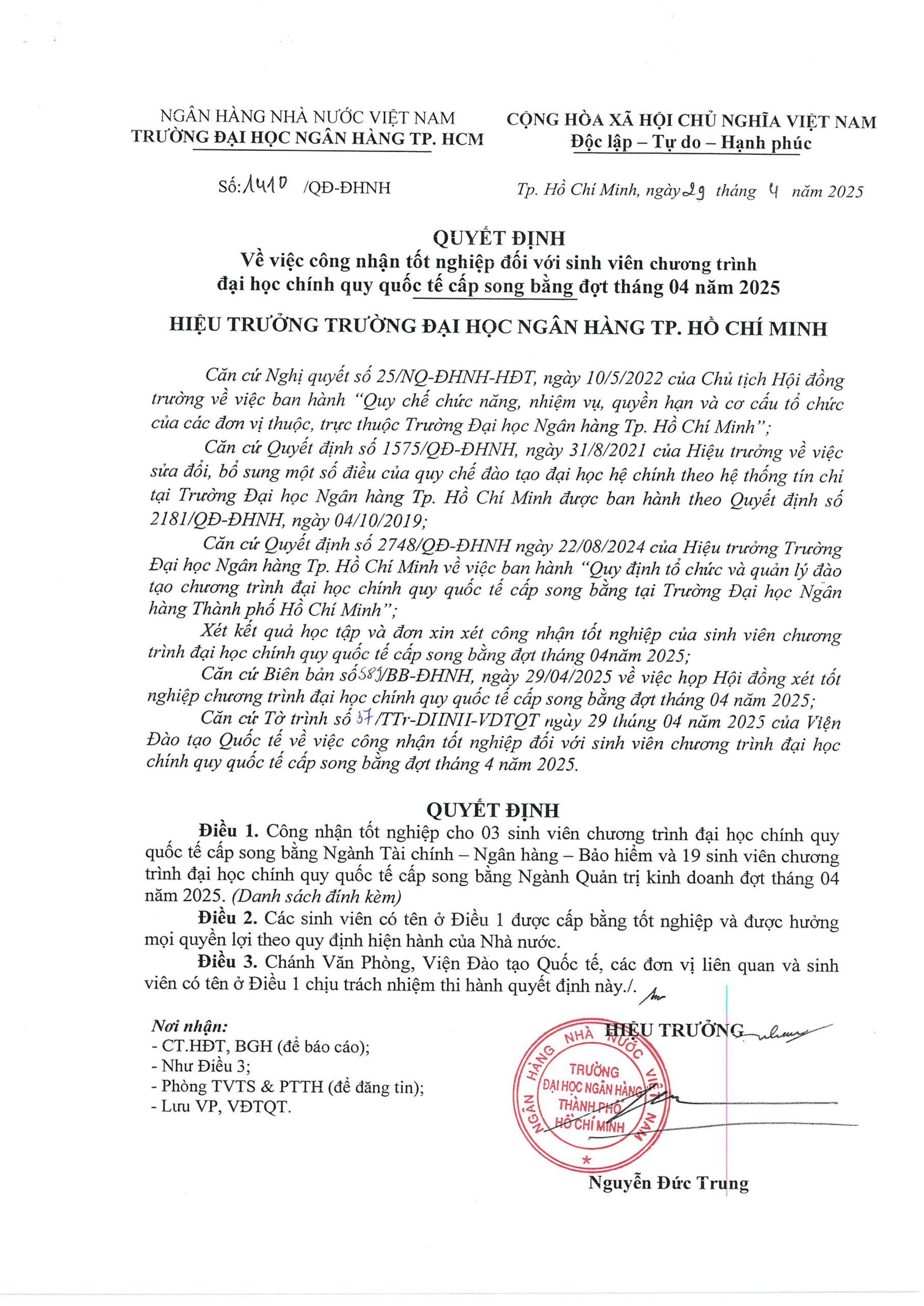 Danh sách tốt nghiệp, Thông báo QUYẾT ĐỊNH Về việc công nhận tốt nghiệp đối với sinh viên chương trình đại học chính quy quốc tế cấp song bằng đợt tháng 04 năm 2025 Posted on 29/04/202517/12/2025 by Nguyễn Thành Công
