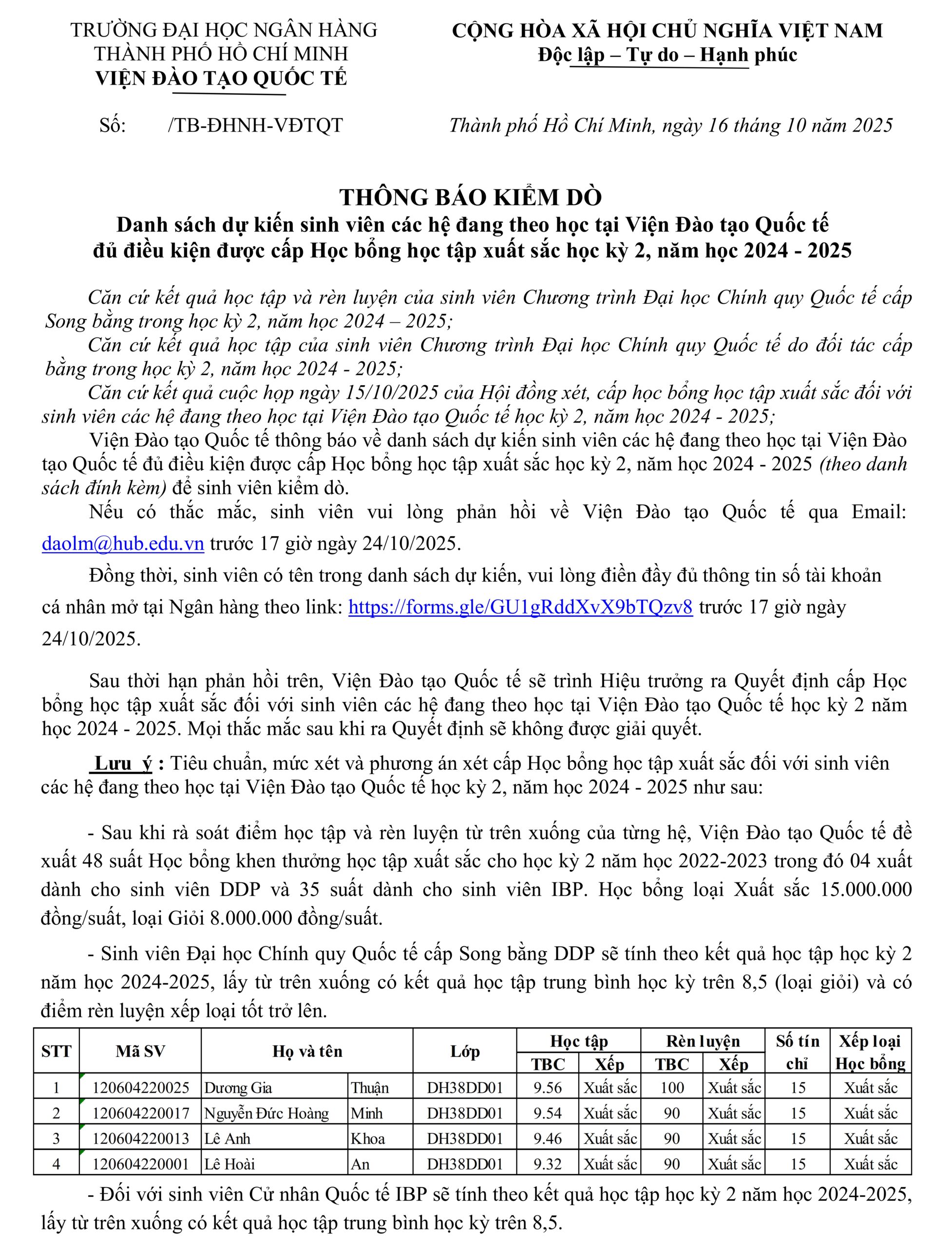 Nếu có thắc mắc, sinh viên vui lòng phản hồi về Viện Đào tạo Quốc tế qua Email: [email protected] trước 17 giờ ngày 24/10/2025.