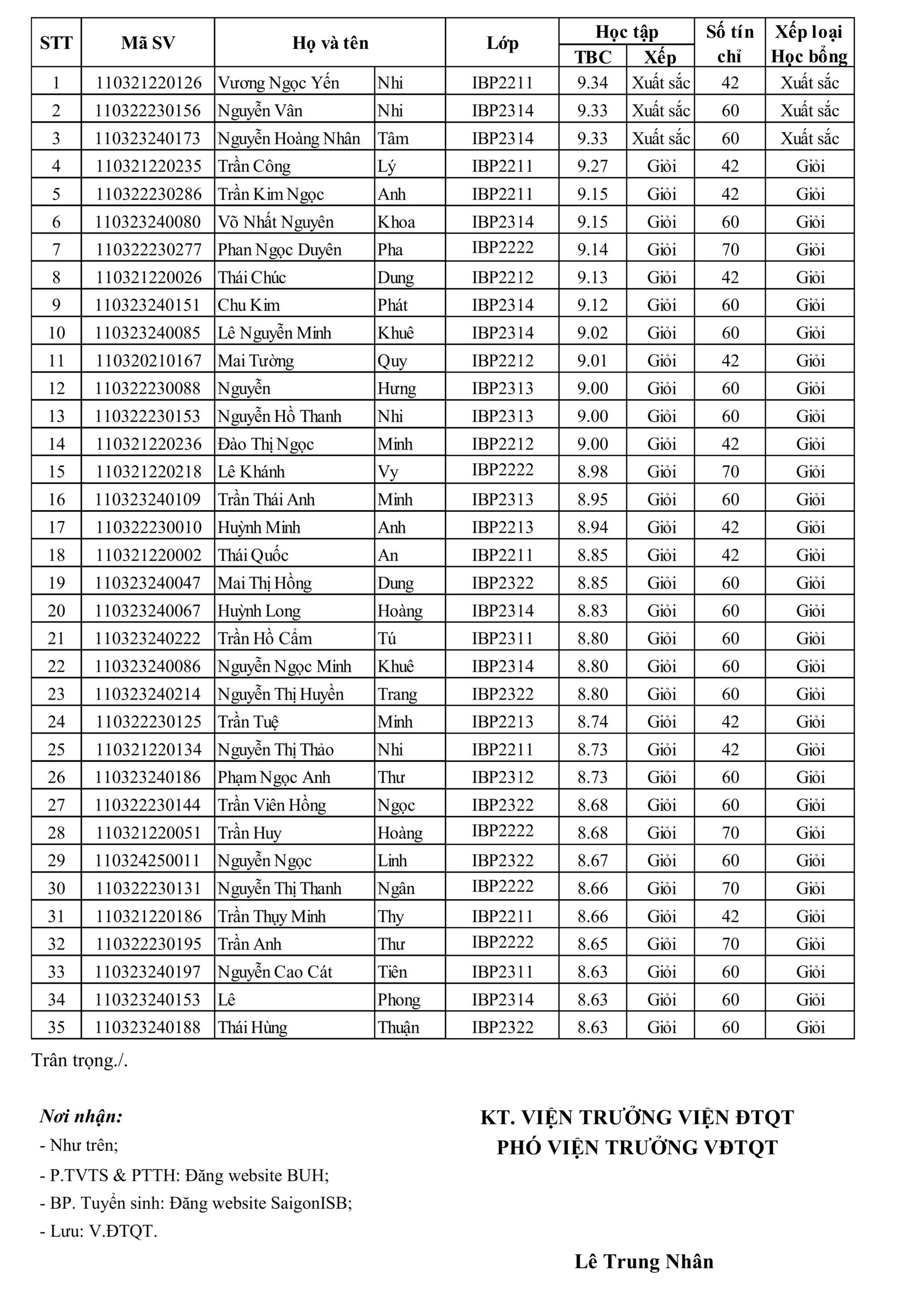 Viện Đào tạo Quốc tế thông báo về danh sách dự kiến sinh viên các hệ đang theo học tại Viện Đào tạo Quốc tế đủ điều kiện được cấp Học bổng học tập xuất sắc học kỳ 2, năm học 2024 – 2025 (theo danh sách đính kèm) để sinh viên kiểm dò.