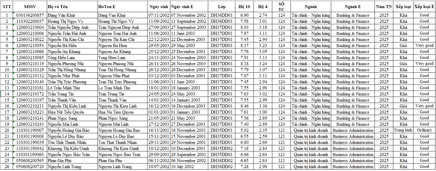 Sinh viên kiểm tra lại chính xác thông tin cá nhân cả tiếng Anh và tiếng Việt (file đính kèm), các thông tin cần kiểm tra: Họ tên, ngày sinh, xếp loại, …. đặc biệt dấu “ư, ơ, I, y…”, khoảng trắng dư.