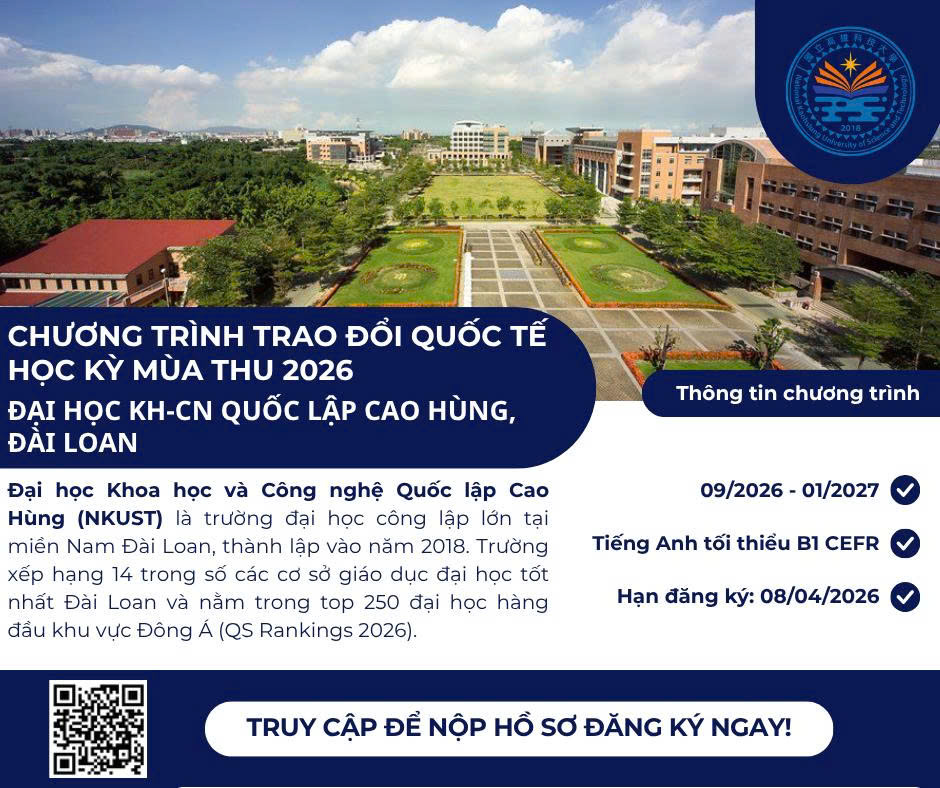 Viện Đào tạo Quốc tế SaigonISB – Trường Đại học Ngân hàng TP.HCM (HUB) trân trọng thông báo đến toàn thể sinh viên HUB về chương trình trao đổi sinh viên quốc tế tại Đại học Khoa học và Công nghệ Quốc lập Cao Hùng (National Kaohsiung University of Science and Technology – NKUST), Đài Loan vào học kỳ mùa Thu năm 2026.